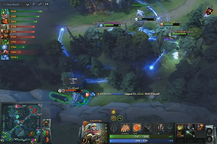 Обычно команды в таких случаях затягивают матч или хотя бы ждут ключевых артефактов. Вместо этого EG полезла в драку через смок, хотя Абеду оставалось менее тысяч золотых до Аганима на Войд Спирите. У EG в принципе не было важных покупок в последние две минуты, зато Noticed из BetBoom бежал на EG со свежим BKB.