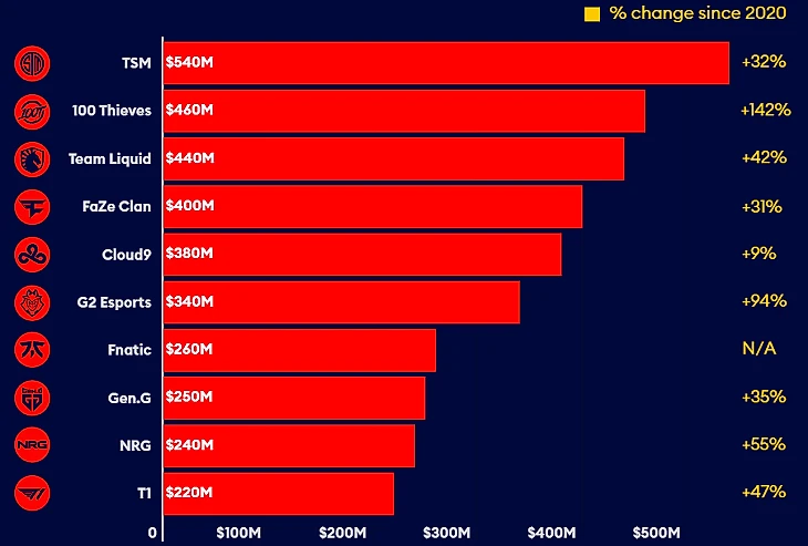 В начале мая Forbes опубликовал рейтинг самых дорогих организаций в киберспорте. TSM заняла первое место в мире с доходом в $56 млн и оценочной стоимостью в $540 млн. За прошедший год компания подорожала на 32%. Главная причина – рекордная спонсорская сделка на $210 млн с криптобиржей FTX.