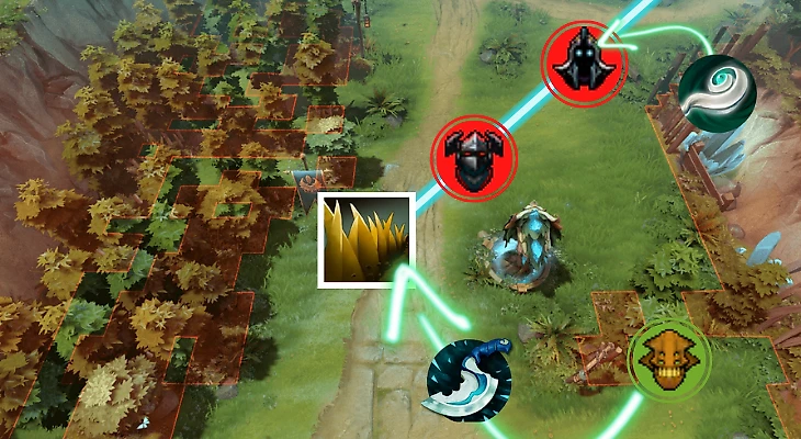 Старайтесь задеть станом как можно больше героев: для того необязательно прыгать вплотную. Нужно быстро ориентироваться и, грубо говоря, чертить себе линии в драке. Допустим, что вашу тир-2 бьют несколько героев: ЦК атакует башню, а за ним стоит Аббадон. Вам с командой надо заберстить ЦК и при этом вывести из строя Аббадона, чтобы он не подсейвил тиммейта. Так получилось, что вы стоите в Тумане Войны и уже не можете поменять позицию.