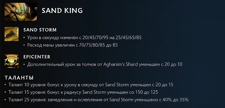До патча 7.31с у Sand King были сумасшедшие 55% винрейта, но Valve быстро прикрыли лавочку. Герой стал более сбалансированным: чуть уменьшили урон (но сказалось это только на начале игры), сузили радиус Sandstorm и уменьшили урон с 20 на 10.