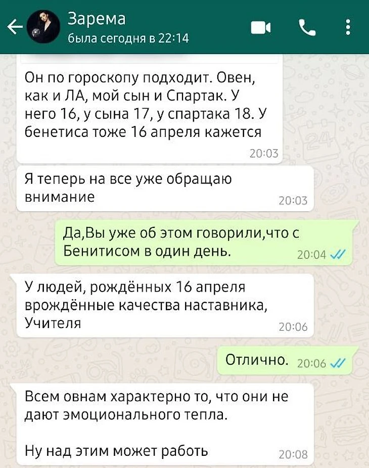 Пояснение: кандидат Руй Витория по знаку зодиака Овен – как и Федун, один из сыновей Заремы, Рафаэль Бенитес (титулованный испанский тренер) и «Спартак» (имеется в виду дата основания клуба). Также Зарема отмечает врожденные качества наставника у людей, которые родились 16 апреля.