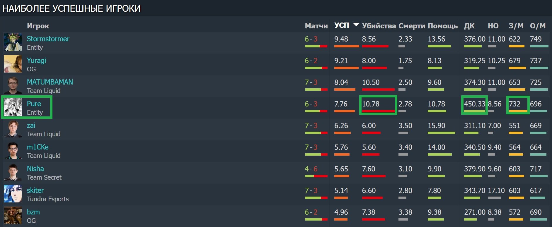 Ну а в Европе Пьюр сразу же рванул с места в карьер: первые серии против Goonsquad и Gladiators он закончил с KDA 37,6 (!) и умер за 4 игры всего трижды! Pure и сейчас лидирует в первом дивизионе Западной Европы сразу по нескольким показателям: