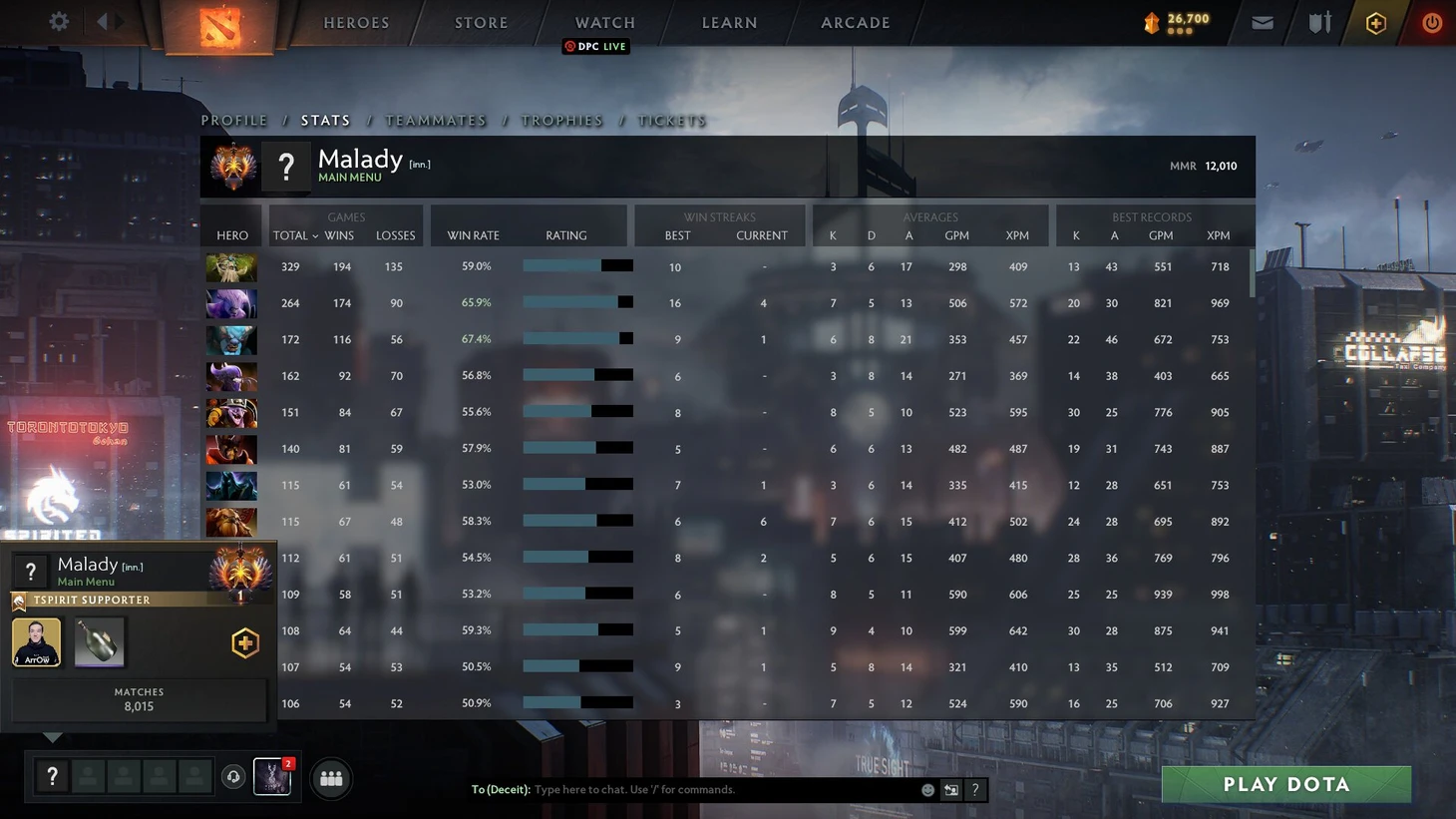 А как научиться круто нажимать скиллы? Много играть в Доту на разных героях, еще больше смотреть матчи и разбираться, кто и что в игре делает. Взять того же Malady: вы думаете он всю жизнь мурчал на пятерке в Дискорде? Вовсе нет, его Дотабафф в матчмейкинге вообще выглядит так, будто бы он оффлейнер. Да здесь даже керри больше, чем пятерок!
