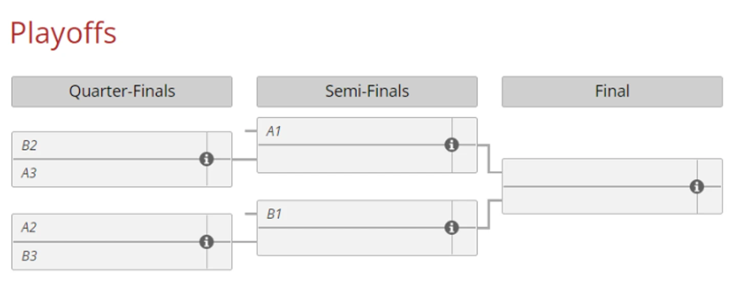 На турнире только одна сетка. Лучшая команда в группе сразу попадает в полуфинал, а две последние вылетают. Все матчи плей-офф пройдут в формате best-of-3.