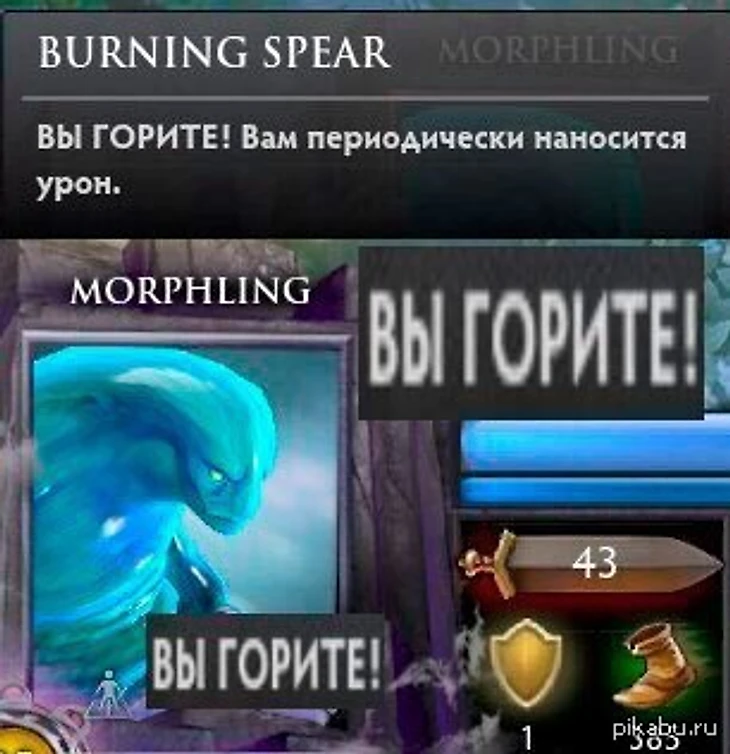 Огнестрелом в Доте владеют не только Снайпер и Гирокоптер. Разве можно назвать холодным оружием горящие копья Хускара? Ведь они подожгут любого: броню ДК, горящего Феникса или Морфлинга из воды. А точно ли из воды? Описание негативного эффекта от Burning Spear звучит так: «Вы горите». Вы, Морфлинг.