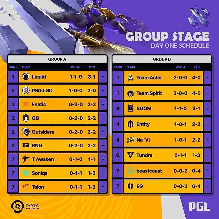 Парочка неожиданностей: 0-4 от EG в первый же день, а Tundra стартовала с поражения от Spirit и ничьей с BOOM – у нее 1-3.