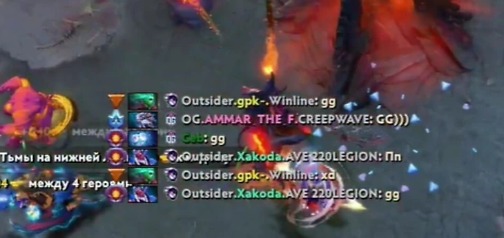 Первая карта серии OG – Outsiders (Virtus.pro) свелась к противостоянию Себа и Гпк. Все началось на 12-й минуте: мидер VP попытался убить саппорта OG, но в итоге умер сам. Ceb ответил фирменным троллингом – написал скобку в чат.
