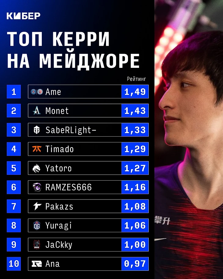★ У чемпионов TI10 ситуация хуже. Пока отлично отыгрывают только Yatoro и Mira. Керри Spirit – третий среди игроков из Восточной Европы после DM’а и Kataomi`. Пока Yatoro идет на 14-й строчке в общей таблице и на 7-й – среди тех, кто приехал не из Китая. К Мире тоже нет претензий: 5-е место в топе четверок и 26-е в глобальном – более чем достойный результат.