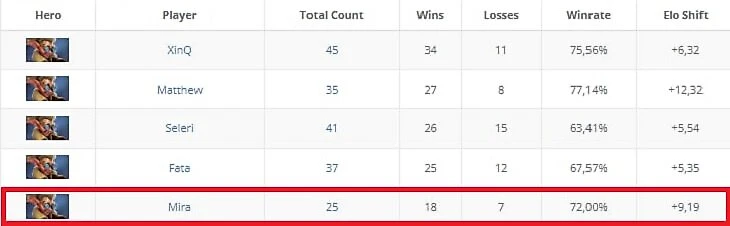 Mira входит в топ-5 исполнителей на Snapfire по Datdota и в топ-3 – по винрейту среди игроков с 10+ матчами на этом герое. Символично, что молодая четверка разрывает рейтинг про-дотеров на свежей бабуле!