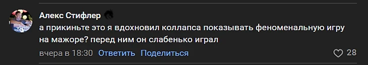 – Мне было очень приятно, что чемпионы мира и, пожалуй, их главная звезда Collapse знают, кто я такой. Оказалось, что он подписан на паблик и время от времени читал мои комменты. Наверное, в какой-то степени я разозлил ребят. У них появилась дополнительная мотивация доказать, что они сильнейшая команда мира, чему я очень рад. На самом деле я больше фанат Spirit, чем их хейтер! Но на Инте буду поддушивать, чтобы не расслаблялись и поборолись за победу.
