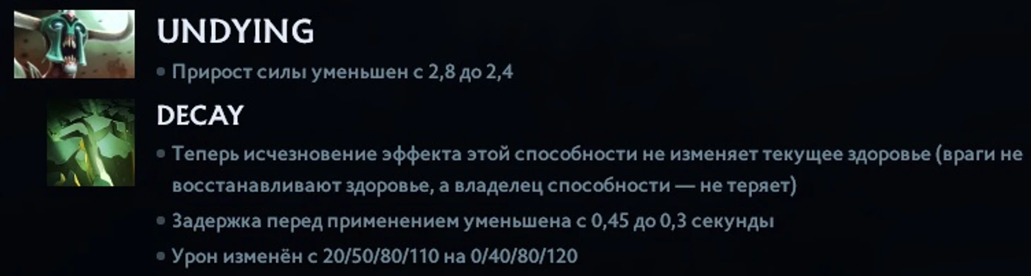 Раньше механика Decay работала таким образом, что ты из любого героя мог сделать Морфа, который полностью перекачался в ловкость. А Морф любит так делать, чтобы быстро отрегениться любым удобным способом, будь то маска, фласка или танго. Это было не очень эффективно на линии: с одной стороны, ты воруешь ХП у врага, с другой стороны, 1 танго теперь ему восстанавливает 30% ХП, а после того, как эффект Decay спадет, он получает обратно свои ХП от украденных статов. Да в таком случае даже понерфленная фласка от тиммейта выглядела вполне неплохой опцией. Проще понять по картинке: