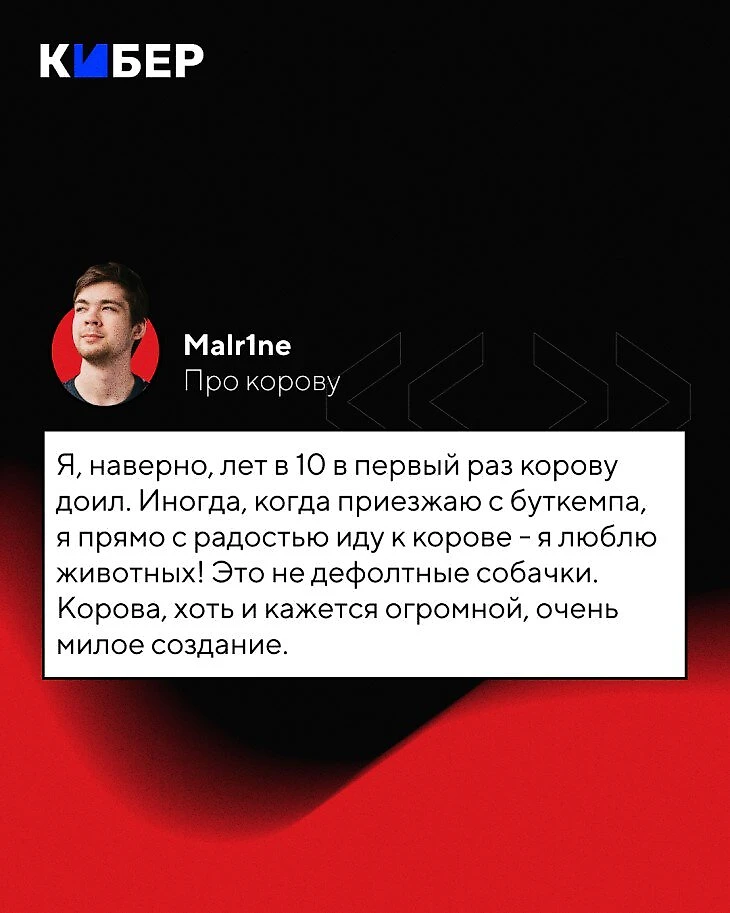 Я, наверно, лет в 10 в первый раз корову доил. Иногда, когда приезжаю с буткемпа, прямо с радостью иду к корове – я люблю животных! Это не дефолтные собачки. Корова, хоть и кажется огромной, очень милое создание.