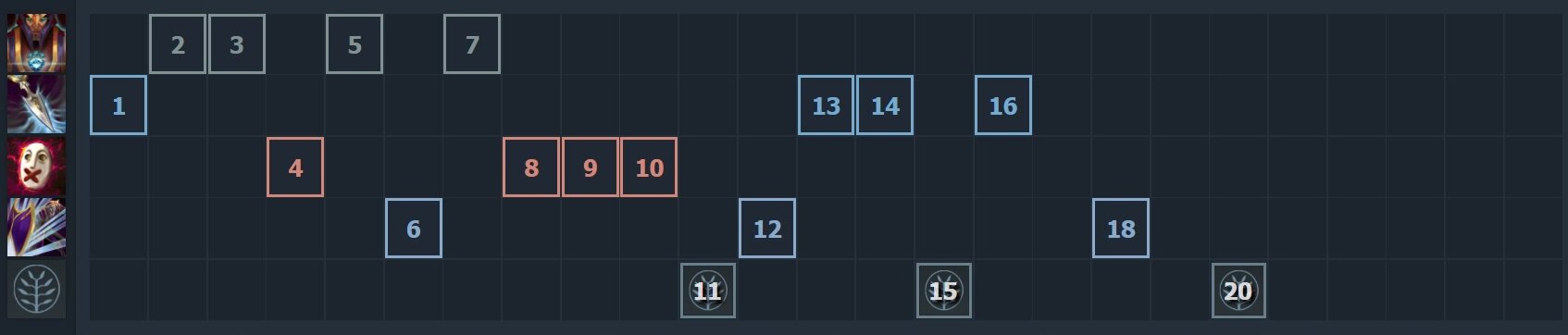 Но есть и еще одна, куда более экзотическая раскачка. С ней играл саппорт LGD y` еще до всех патчей – и протестировал ее снова совсем недавно: 1-4-1 через Глейвы, а дальше уже в способности. Такая раскачка работает исключительно против слабой линии (например, 2 милишника или герой без активных/спам-способностей) и исключительно с полукоровым айтембилдом – в данном случае 3 WB, Пика и Шард.