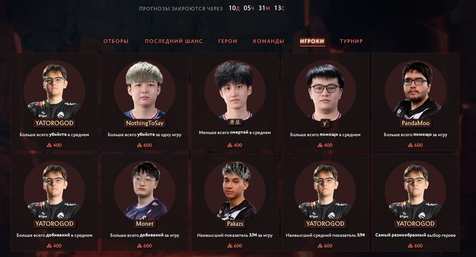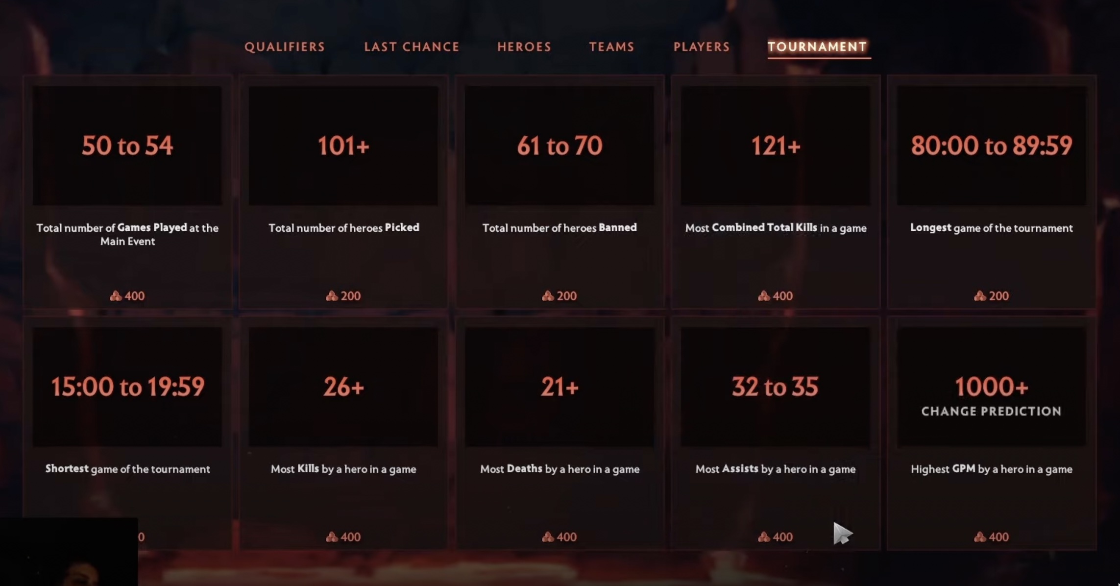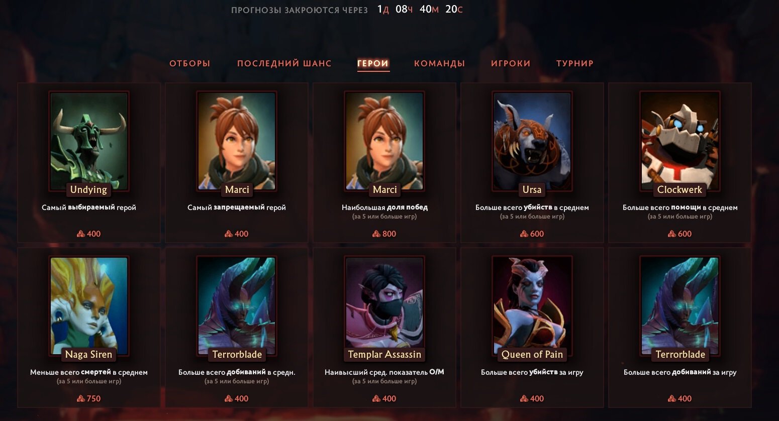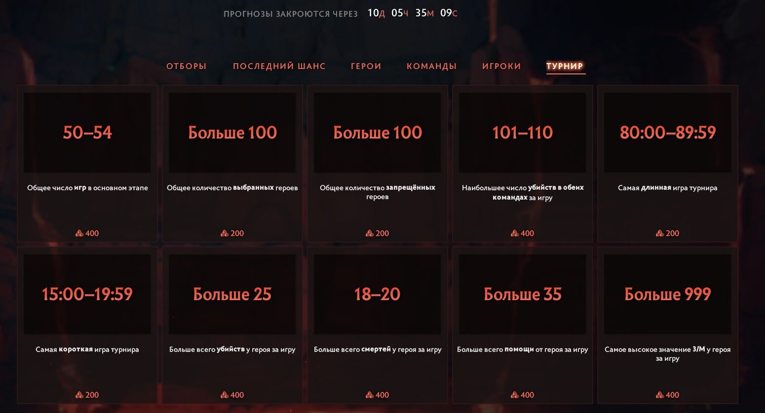 1 октября Valve открыла возможность всем владельцам Боевого пропуска делать традиционные прогнозы на The International 2022. Предсказания можно сделать в категориях «Герои», «Команды», «Игроки», «Турнир» и получить за каждый верный прогноз от 200 до 800 боевых очков.