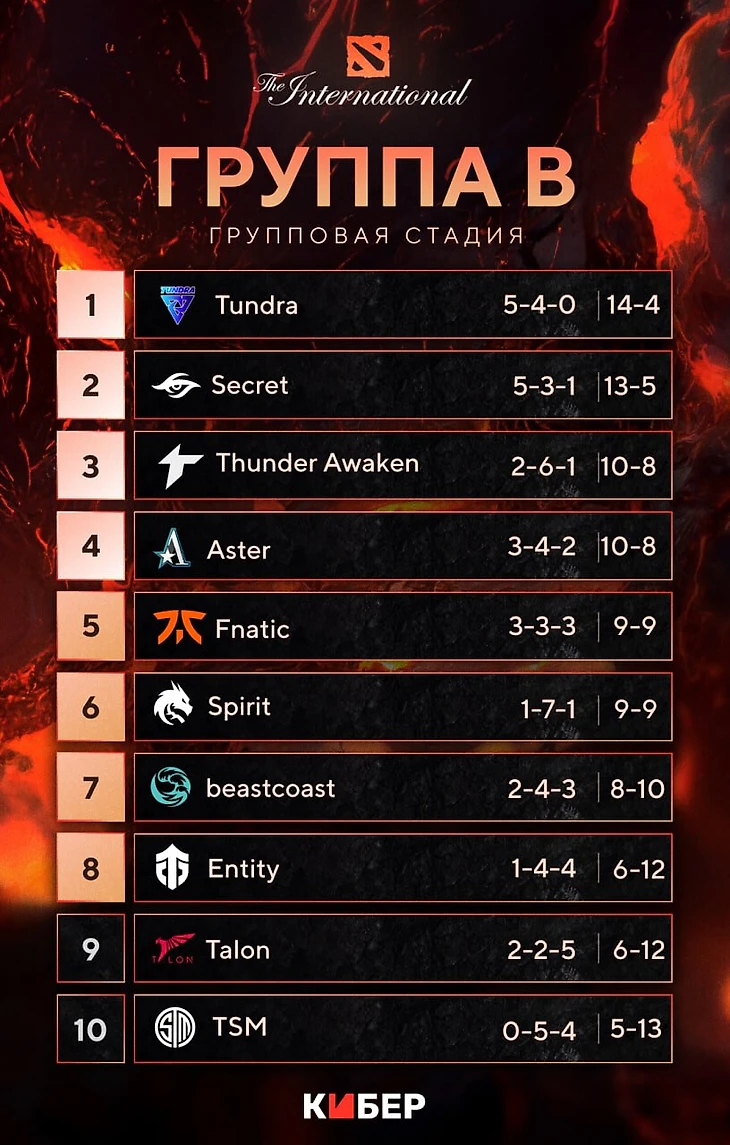 Группа B: Team Spirit, Beastcoast, Aster, Thunder Awaken, TSM, Tundra, Evil Geniuses, Fnatic, Entity, Talon, Team Secret.