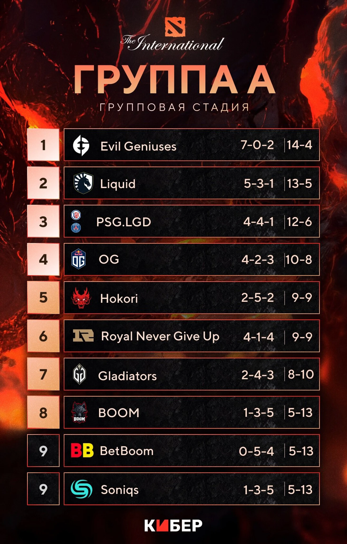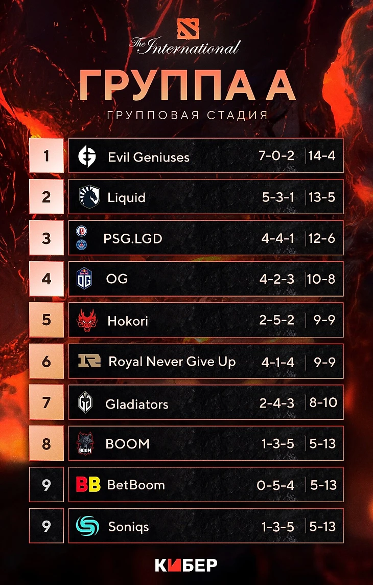 Группа А: BetBoom, Gaimin Gladiators, Evil Geniuses, PSG.LGD, OG, Boom, Hokori, Royal Never Give Up, Soniqs, Liquid.