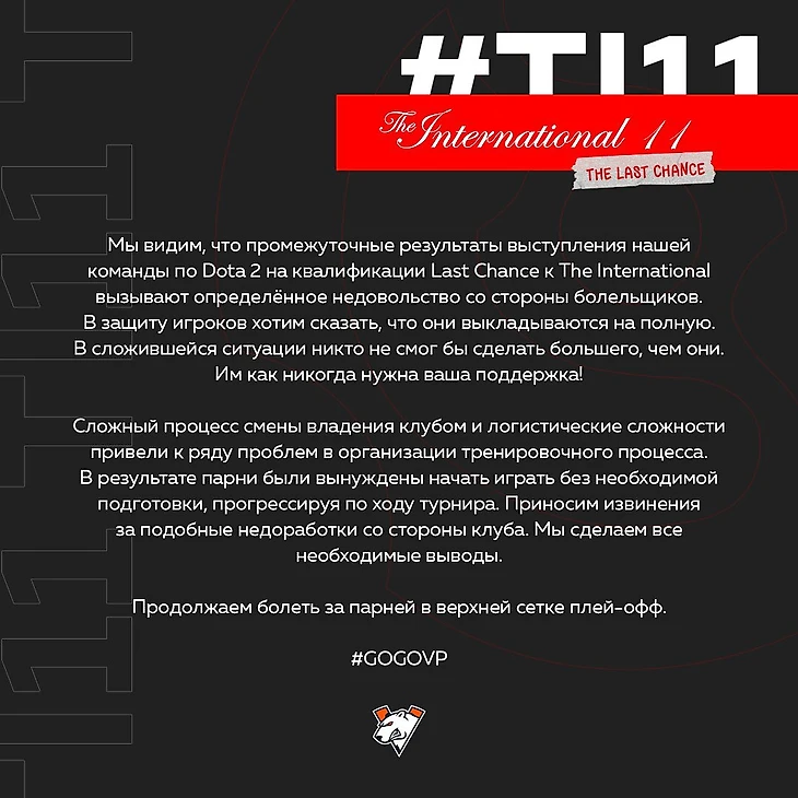 Руководство команды прямым текстом сказало в обращении, что все в порядке, вы только что проиграли двум командам, которые (скриньте) точно войдут в топ-8 TI. А Gpk включил режим «Горит сарай, гори и хата».