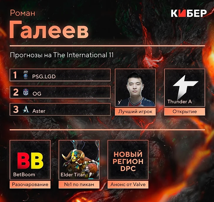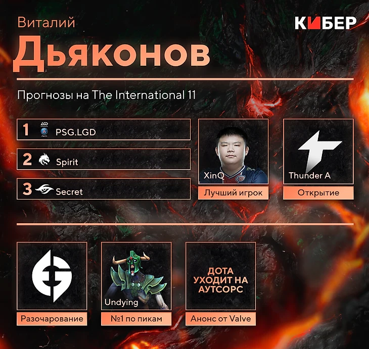 Я 4 года и 3 Инта подряд ставлю победителем PSG.LGD – и так просто не остановлюсь. Хочу такой же гранд-финал, как в прошлом году. Хочу битву и реванш! OG тоже обязана быть высоко. Молодые ребята, сменившие величайшую команду в истории Доты, покажут силу полного состава! Думаю, они проиграют лишь Team Spirit в малом финале. Побеждать им пока рано.
