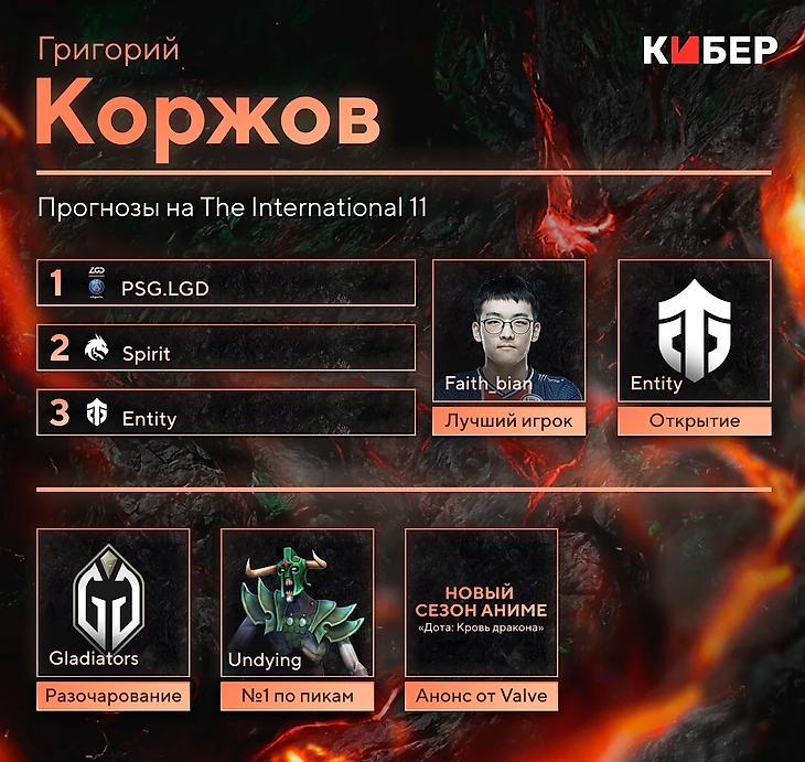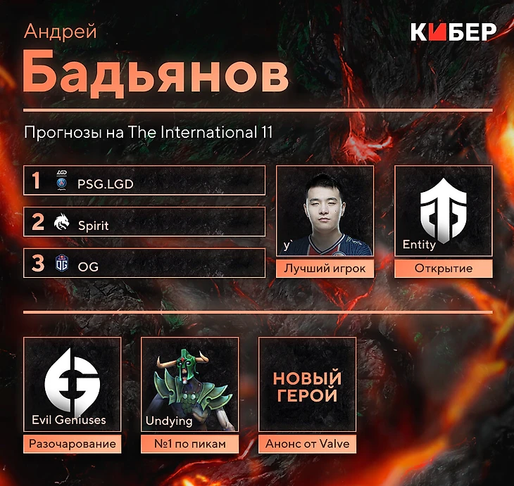 Да, я тоже верю в повторение финала TI10. PSG.LGD и Team Spirit слишком сильны – это две с отрывом лучшие команды мира. И я также поставлю на китайцев в финале: на их стороне как минимум патч и мотивация. Текущая мета максимально подходит PSG.LGD, при этом она точно выйдет на Spirit с горящими от злости глазами. Думаю, это и сделает разницу. К тому же удача явно задолжала китайцам за два предыдущих финала. Ну а при победе PSG.LGD лучшим игроком станет Faith_bian – идеальный дотер, заслуживший идеальный конец карьеры.