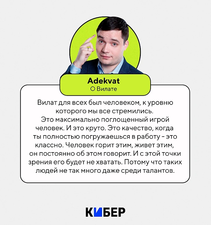 – Вилат для всех был человеком, к уровню которого мы все стремились. Это максимально поглощенный игрой человек. Он полностью ей окутан. И это круто. Это качество, когда ты полностью погружаешься в работу – это классно. Человек горит этим, живет этим, он постоянно об этом говорит. И с этой точки зрения его будет не хватать. Потому что таких людей не так много даже среди талантов.