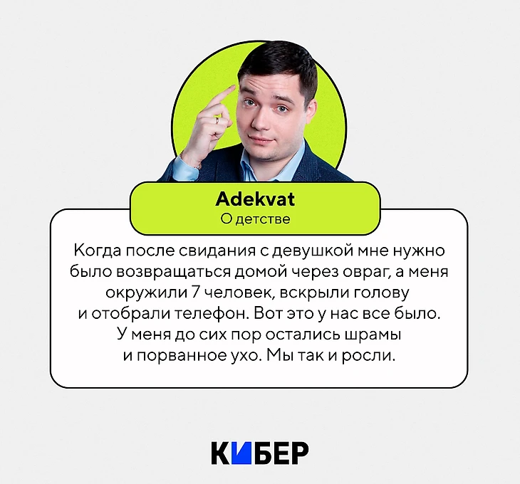 Это то, что я пережил. Это то, что меня в какой-то момент чуть к смерти не привело. Когда после свидания с девушкой мне нужно было возвращаться домой через овраг, меня окружили 7 человек, вскрыли голову и отобрали телефон. Вот это у нас все было. У меня до сих пор остались шрамы и порванное ухо. Мы так и росли.