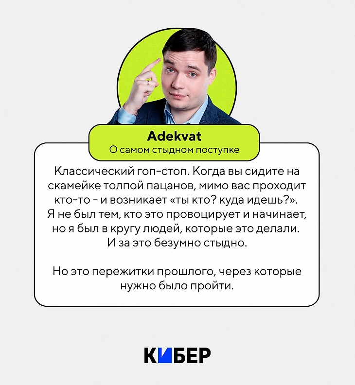 – Классический гоп-стоп. Когда вы сидите на скамейке толпой пацанов, мимо вас проходит кто-то – и возникает «ты кто? куда идешь?» Я не был тем, кто это провоцирует и начинает, но я был в кругу людей, которые это делали. И за это безумно стыдно.