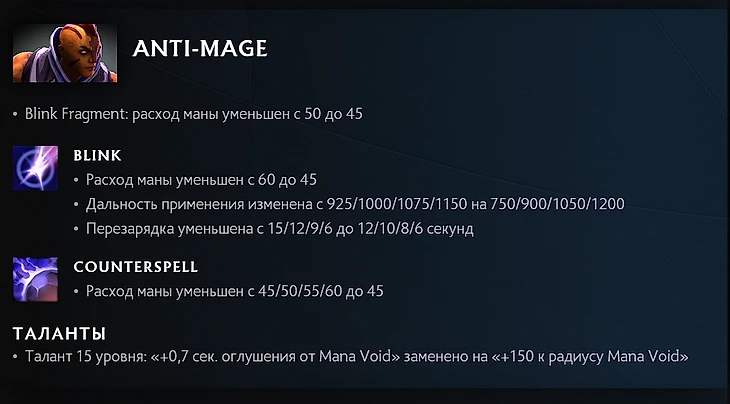 АМ независимо от патча был ситуационным героем, который в зависимости от пика кидается в крайности: рассыпается от мощных физ. дд и почти без шансов уничтожает нюкеров. И на самом деле сложно понять ,почему Анти-маг так плох сейчас, ведь он неплохо себя чувствует против метовых героев ,типо Leshrac ,Morphling ,Arc Warden . Плюс в патче 7.32 АМа неплохо бафнули , но при этом он все равно остается слабым и часто бесполезным персонажем.