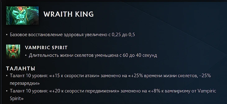 На самом же деле сильно пострадал фарм-потенциал: Скелетов неплохо подрезали, а ведь это единственная фарм-механика Врейз Кинга. Теперь скелеты будут убивать на 1-у,а может даже и 2-е пачки крипов меньше, что очень плохо(Отчасти компенсируется левым талантом на 10-ом,но раньше там был более важный атакспид) Заменили таланты на скорость атаки и мув.спид ,а ведь это ВАЖНЕЙШИЕ показатели для любого керри(и особенно для Wraith King). 2.WK уязвим на линии: несмотря на неплохой стан,315 муспида и 62 урона, он имеет всего 1 единицу брони , и разбить ему лицо в начале не составляет труда.