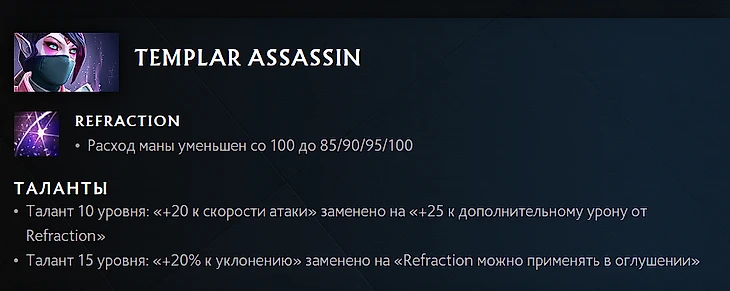 Намного большее влияние на Темпларку оказал патч и мета в целом.Игры стали дольше,всё чаще на 2-ую и 3-ую позицию пикаются жадные герои,с которыми Ланайя соверешенно не стакается, а неприятные для TAшки Silencer ,Arc Warden и Spectre плотно засели в мете.В целом ,несмотря на все нерфы и патч,герой не самый худший ,но если в вашей команде на миде стоит Tinker,в сложной Windranger,а ваш саппорт 5-ка решил взять Паджика,от Templar Assassin точно стоит отказаться.
