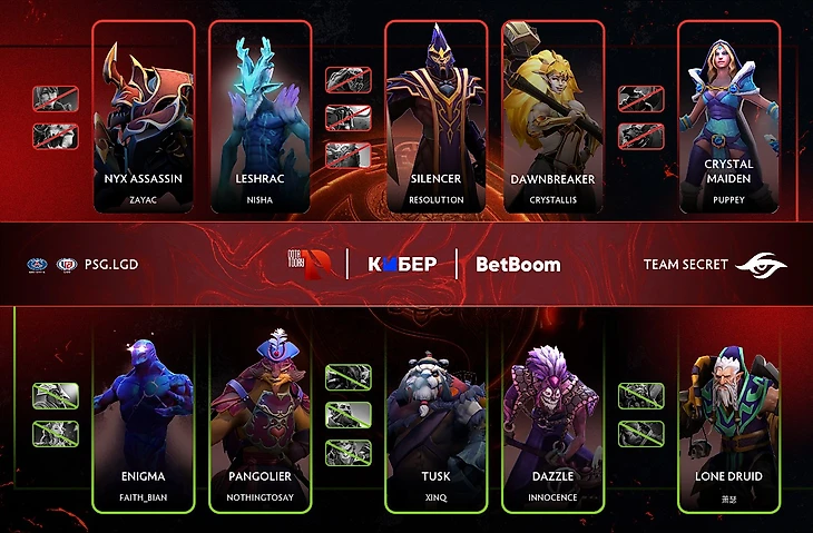 Любимый Nyx для Зайца + супер метовый Leshrac, которого можно зафлексить на две позиции. Ответка от китайцев в виде сигнатурных Pango + Enigma. Во второй стадии PSG добрали двух сильных саппортов Dazzle + Tusk, а в ответ получили шикарный ответ от Puppey в виде Silencer + Dawnbreaker. На первый взгляд, Puppey сделал совершенно дефолтный мув, добрав во второй стадии крепкую лёгкую линию, но на деле это была заготовка, к которой Директор оказался не готов. Неплохой Lone Druid на 23 пик для Ame, а лидер Secret закрывает драфт своей любимой Crystal Maiden, отправляет Silencer на тройку, полностью переигрывая оппонентов на драфте.