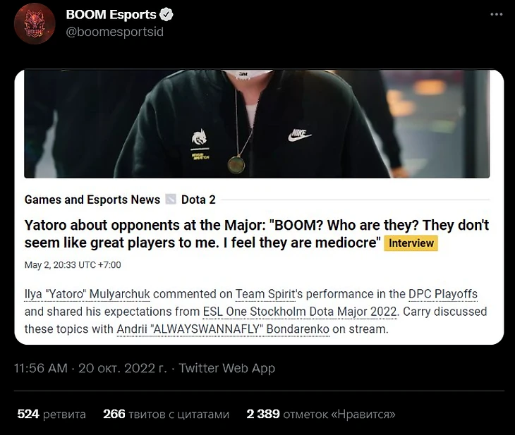 В мае, за неделю до мейджора в Стокгольме, Yatoro приходил на стрим к Alwayswannafly, где обсуждал разные команды. И больше всего досталось как раз BOOM Esports. Слова Ильи Мулярчука приводит escorenews: