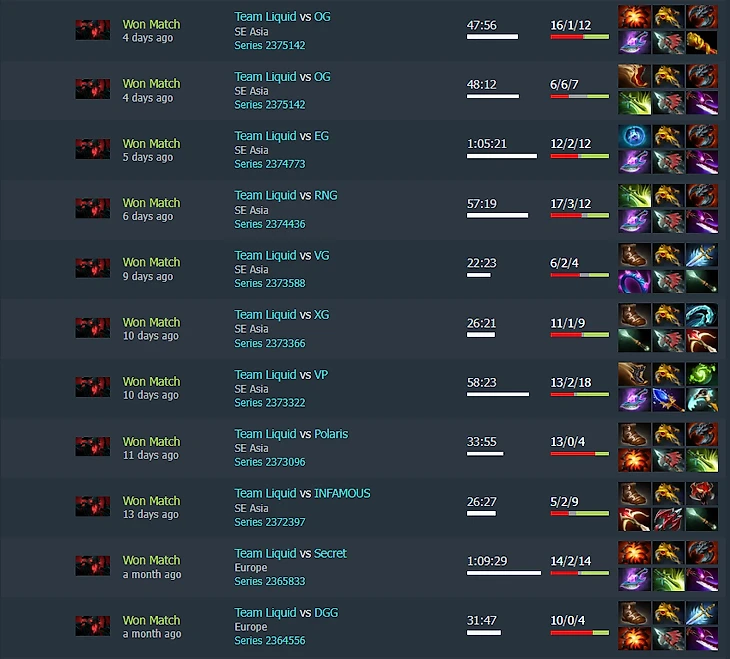Liquid начала путь на The International еще с региональной квалификации, после которой отправилась в Last Chance, и лишь там добилась места в двадцатке лучших. В группах команда заняла второе место, уступив лишь EG.