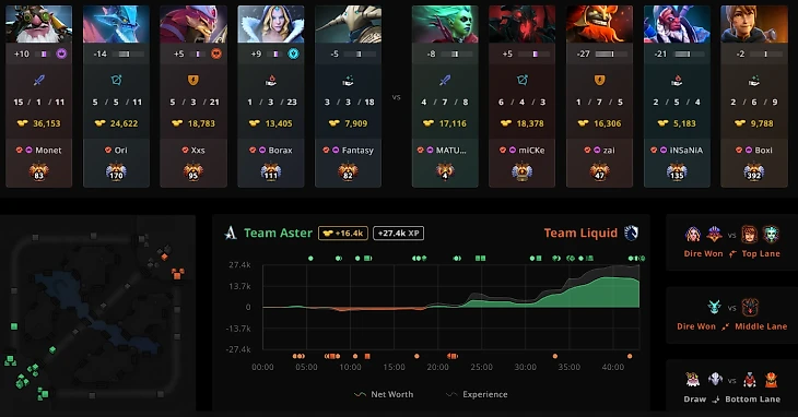 2. Aster не форсировала события. Начало мидгейма было однозначно за Liquid. Если бы Aster принимала драки, то потеряла инициативу и отпустила европейцев вперед. Вместо этого китайцы играли на фарм, за счет чего вышли в такие артефакты, при которых соперники не могут забить Снайпера за инициацию. В длинной драке Sniper не проигрывает.