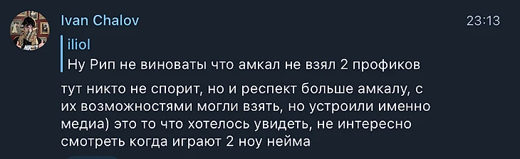 RIP и CKS, как составы с наибольшим числом профессионалов в основе и запасе, конечно, критически относятся к замечаниям, в духе — регламент не нарушили, какие могут быть вопросы. Вот мнение Эмиля и Максима Мякова на этот счет, например.