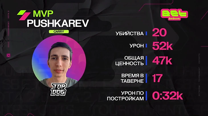 Вера BetBoom в TOP DOG себя оправдала — команда начала с ранней агрессии и столь активно душила соперников, что у тех не было возможности что-либо противопоставить уверенной игре TD. В конечном итоге счет по киллам составил 45:27, TOP DOG взяла карту в свою копилку, а лучшим стал GADAEV, отыгравший на Клоке-саппорте.