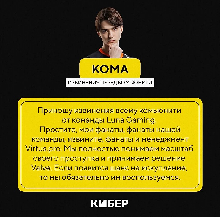 Koma`: «Приношу извинения всему комьюнити от команды Luna Gaming. Простите, мои фанаты, фанаты нашей команды, извините, фанаты и менеджмент Virtus.pro. Мы полностью понимаем масштаб своего проступка и принимаем решение Valve. Если появится шанс на искупление, то мы обязательно им воспользуемся».