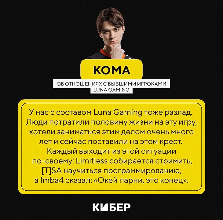 Koma`: «У нас с составом Luna Gaming тоже разлад. Люди потратили половину жизни на эту игру, хотели заниматься этим делом очень много лет и сейчас поставили на этом крест. Каждый выходит из этой ситуации по-своему: Limitless собирается стримить, [T]SA научиться программированию, а Imba4 сказал: «Окей парни, это конец»».