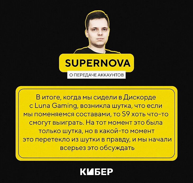 В итоге, когда мы сидели в Дискорде с Luna Gaming, возникла шутка, что если мы поменяемся составами, то S9 хоть что-то смогут выиграть. Тогда это была только шутка, но в какой-то момент это перетекло из шутки в правду, и мы начали всерьез это обсуждать. Было много разных аргументов за и против, но спустя какое-то время мы решили обратиться к Luna Gaming за этой возможностью».