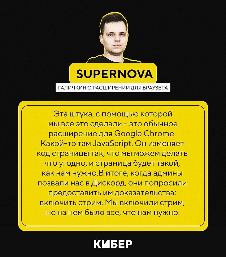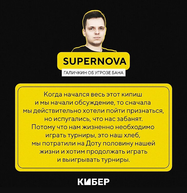 Supernova: «Я Виктор «Supernova» Галичкин, в прошлом игрок S9. Вы все наверняка в курсе ситуации с банами. Мы сейчас записываем это видео, чтобы вы знали, как все было на самом деле.