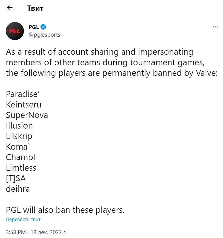 «В результате совместного использования аккаунтов и выдачу себя за членов других команд во время турнирных игр следующие игроки навсегда были забанены Valve: Paradise`, Keintseru, SuperNova, Illusion, Lilskrip, Koma`, Chambl, Limitless, [T]SA, deihra. PGL также банит этих игроков».
