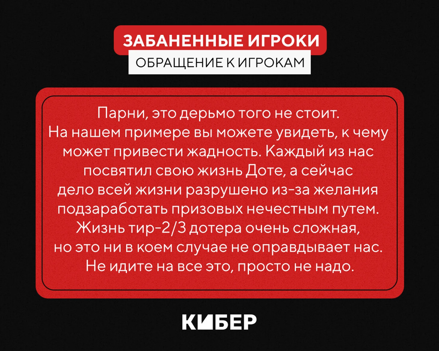 После той встречи большая часть опытных игроков, которые смотрели записи, и так уже знали, кто именно играл этот матч, однако эти доводы были проигнорированы. Если вдруг какой-либо организации интересно пообщаться на тему «как защитить наш турнир лучше», мы с радостью проконсультируем их. И в-третьих, мы хотим обратиться к другим игрокам. Парни, это дерьмо того не стоит. Вот честно. Наш пример показывает, к чему может привести жадность. Каждый из нас посвятил свою жизнь Доте, а сейчас дело всей жизни разрушено из-за желания подзаработать призовых нечестным путем. Жизнь тир-2/3 дотера очень сложная, но это ни в коем случае не оправдывает нас.