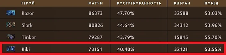 Сейчас Рикимару – один из самых востребованных героев Доты. В пабликах на Титанах в патче 7.32d он идет в этом списке на четвертом месте. Рядом с «королем матчмейкинга» – Сларком, Разором с Бладстоуном и вечно забаненным Тинкером.