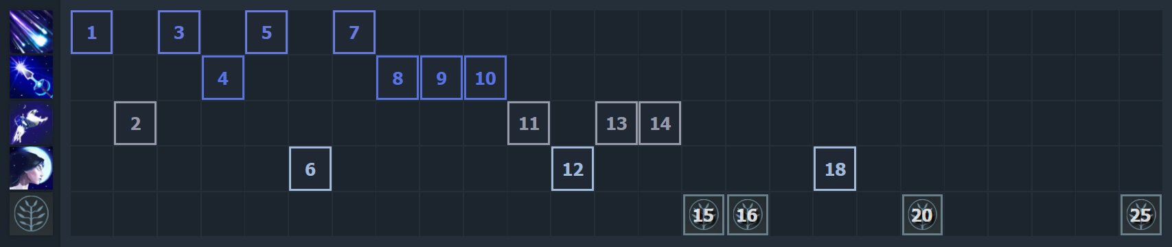 Здесь все очень просто и метово. С Starstorm на первом и третьем уровне можно делать все: размениваться с вражеским саппортом, харрасить сразу двух героев, добивать ренджей и знаменосцев. А надежный Лип на втором позволит не умереть даже против сильной линии.