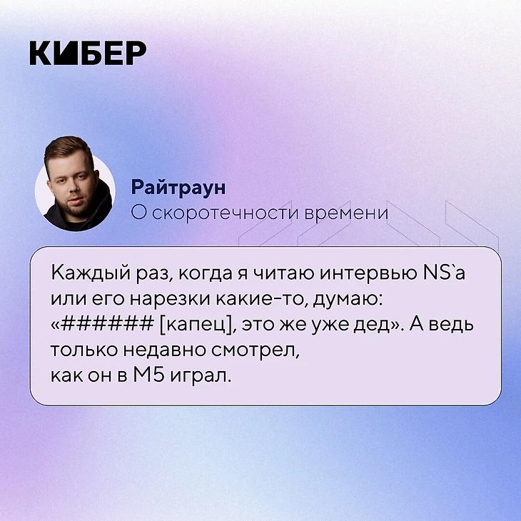 Каждый раз, когда я читаю интервью NS’а или его нарезки какие-то, думаю: «###### [капец], это же уже дед». А ведь только недавно смотрел, как он в M5 играл. Все корабль, все в Артстайла, Куронити убирает Артстайла, Гоблин ультует… Я все это помню!