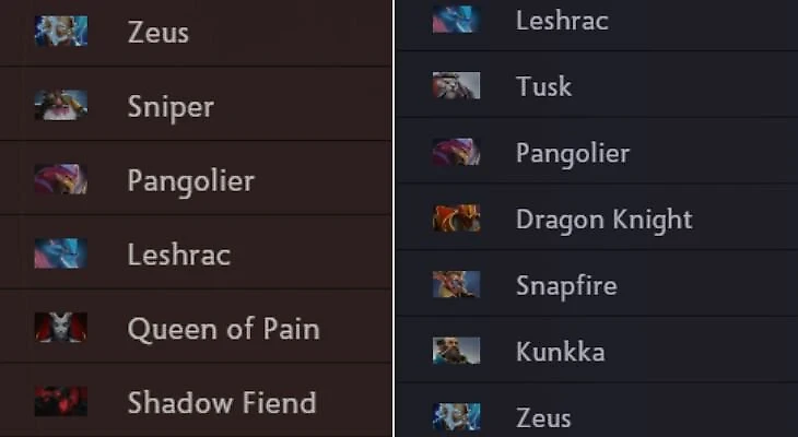 Вы заметили, что мета с Инта практически не поменялась? Персонажи такие же, карту и экономику 7.32d не тронул, а сильные фиксы достались только Wraith Pact. Следовательно, и задачи в игре сохранились – для всех десяти игроков. Но Ларлу оставили лишь Пангольера и Лешрака. Взгляните на картинку, красным выделены его герои на Инте, синим – в лиге. Персонажи совершенно другие, как и общий плейстайл для них.