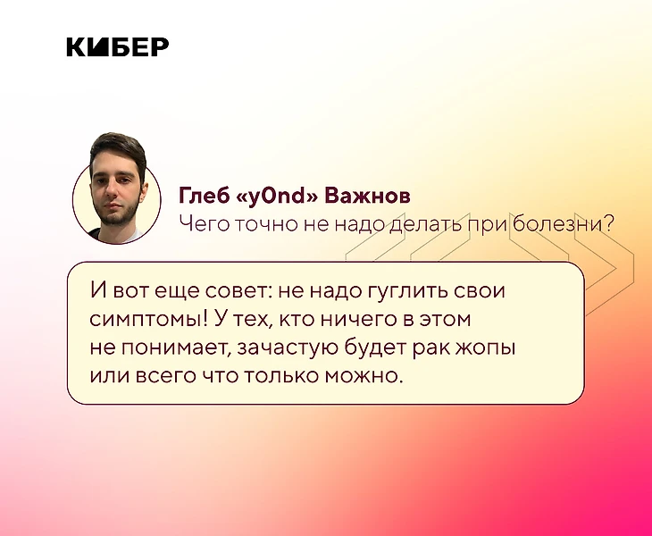 И вот еще совет: не надо гуглить симптомы! Те, кто ничего в этом не понимает, найдет так рак жопы или всего, что только можно. И сразу же будет контекстная реклама на прием по месту жительства за 1,5 тысячи рублей со всеми анализами. Надо иметь критическое мышление.