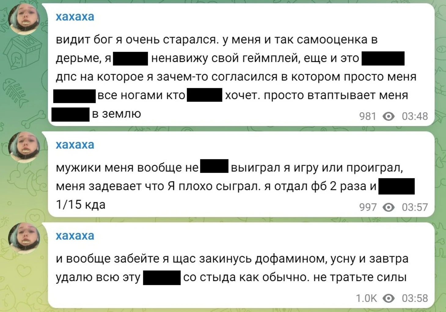 – В основном я тильтую только с себя, меня особо не волнуют другие люди. Я хочу убить себя и я стараюсь в эти моменты не убивать себя.