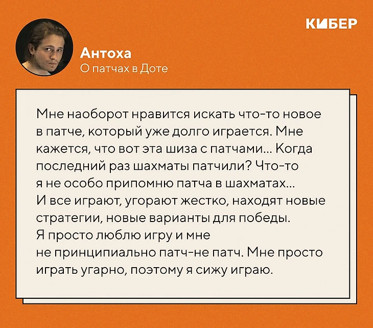 – А мне наоборот нравится искать что-то новое в патче, который уже долго играется. Мне кажется, что вот эта шиза с патчами... Когда последний раз шахматы патчили? Что-то я не особо припомню патча в шахматах... И все играют, угорают жестко, находят новые стратегии, новые варианты для победы. Я просто люблю игру и мне не принципиально патч-не патч. Мне просто играть угарно, поэтому я сижу играю.