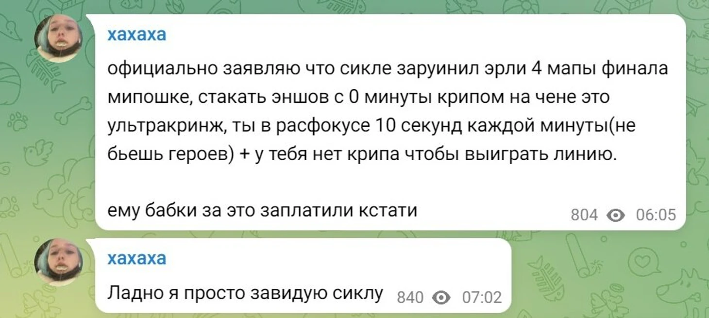 – Ты писал, что Сикл заруинил Мипошке ерли-гейм 4-й карты финала мейджора на Чене. Что стакать Эншей с 0 минуты – ультракринж, что ты постоянно в расфокусе и на линии ты не можешь выиграть из-за того, что у тебя нет крипа. Как ты считаешь, ты лучше Сикла разбираешься в аспектах игры на герое?