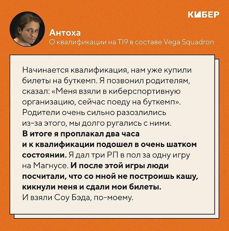 Начинается квалификация, нам уже купили билеты на буткемп – я должен ехать. Я сходил на пары, и между учебой и квалификацией было около двух часов. Я позвонил родителям, сказал: «так-то, так-то, меня взяли в киберспортивную организацию, сейчас поеду на буткемп». И родители очень сильно разозлились из-за этого, мы очень долго ругались с ними. В итоге я проплакал все эти 2 часа и к квалификации подошел в очень шатком состоянии. Там была игра, где я дал 3 РП в пол за одну игру на Магнусе-саппорте. И после этой игры, видимо, люди посчитали, что со мной не построишь кашу, кикнули меня и сдали мои билеты на буткемп. И взяли Соу Бэда, по-моему.